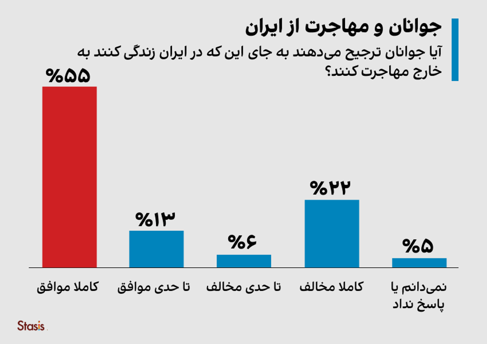 بر اساس نظرسنجی موسسه استاسیس مستقر در واشینگتن، ۶۸ درصد ایرانیها و ۷۷ درصد از پاسخدهندگان در گروه سنی ۱۸ تا ۲۹ سال، با این عبارت موافقاند که جوانان ایرانی ترجیح میدهند به جای کشورشان، مهاجرت کنند و در خارج از ایران زندگی کنند.