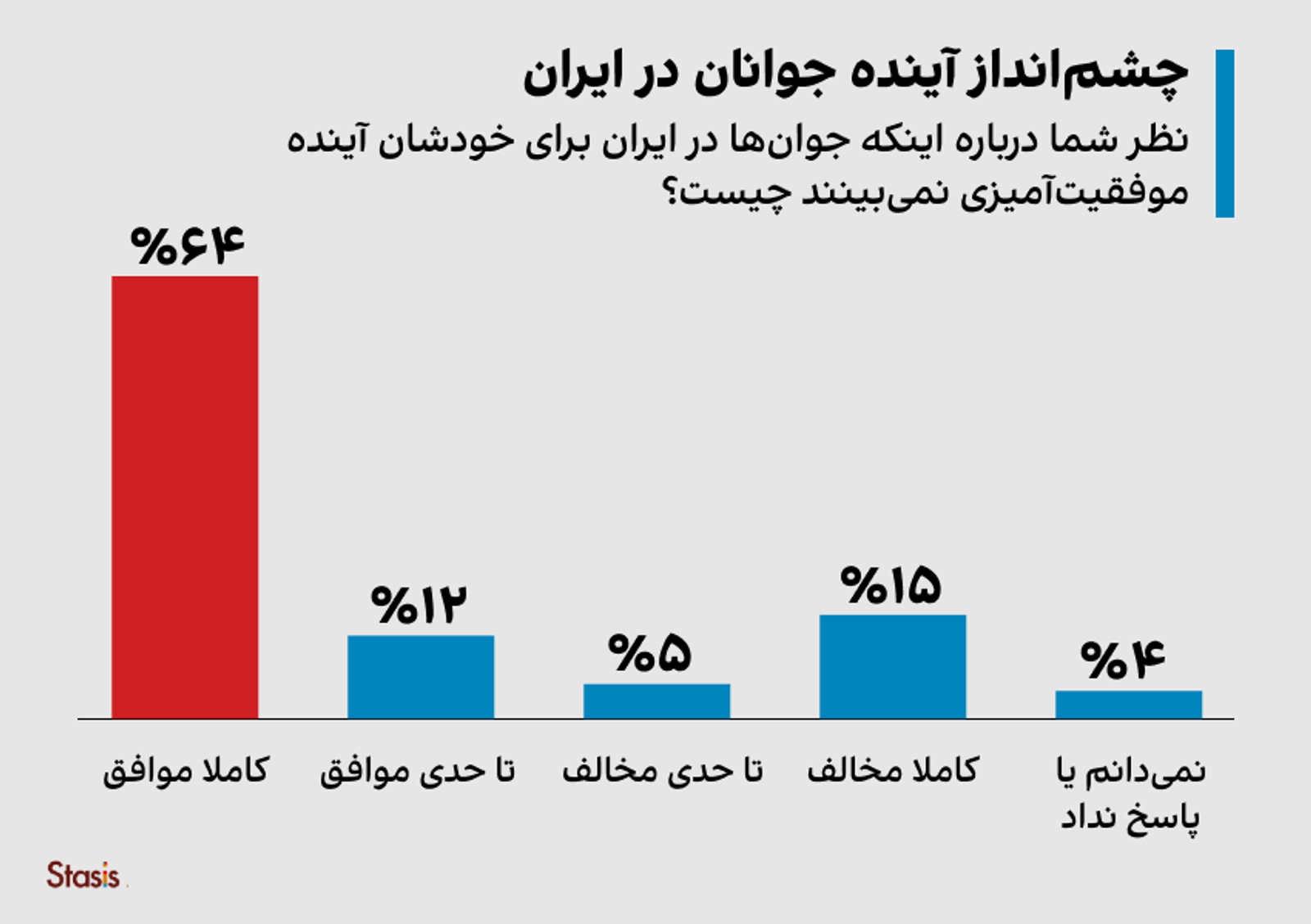 بر اساس نتایج جدیدترین نظرسنجی موسسه استاسیس، حدود ۷۶ درصد از مردم ایران معتقدند که جوانان در ایران برای خودشان آینده موفقیتآمیزی نمیبینند و این رقم در میان کسانی که در گروه سنی ۱۸ تا ۲۹ قرار دارند ۸۲ درصد است.