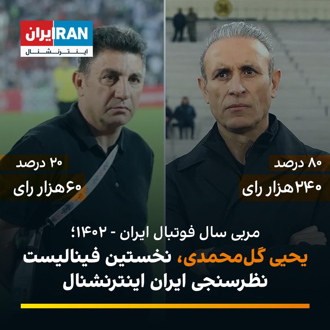 یحیی گلمحمدی، سرمربی پیشین پرسپولیس و قهرمان سهگانه فوتبال ایران در فصل گذشته، با رای مخاطبان ایران اینترنشنال در رقابت با امیر قلعهنویی، سرمربی تیم ملی به عنوان نخستین فینالیست نظرسنجی مربی سال ۱۴۰۲ ایران شناخته شد.