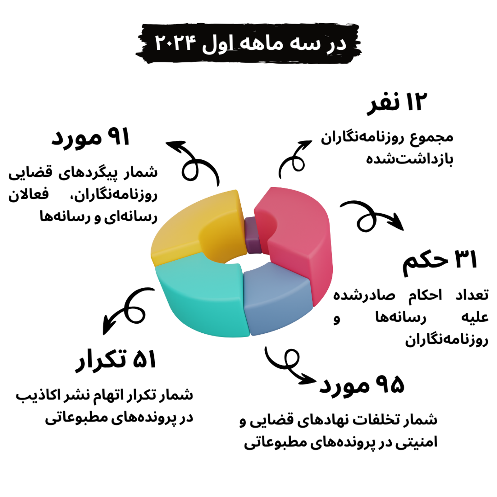 سازمان «دفاع از جریان آزاد اطلاعات» در گزارش خود درباره سرکوب رسانه‌ها و روزنامه‌نگاران در ایران در سه ماهه اول سال ۲۰۲۴ نوشت دست‌کم ۹۱ رسانه، روزنامه‌نگار و فعال رسانه‌ای در این بازه زمانی تحت پیگرد قضایی قرار گرفتند.