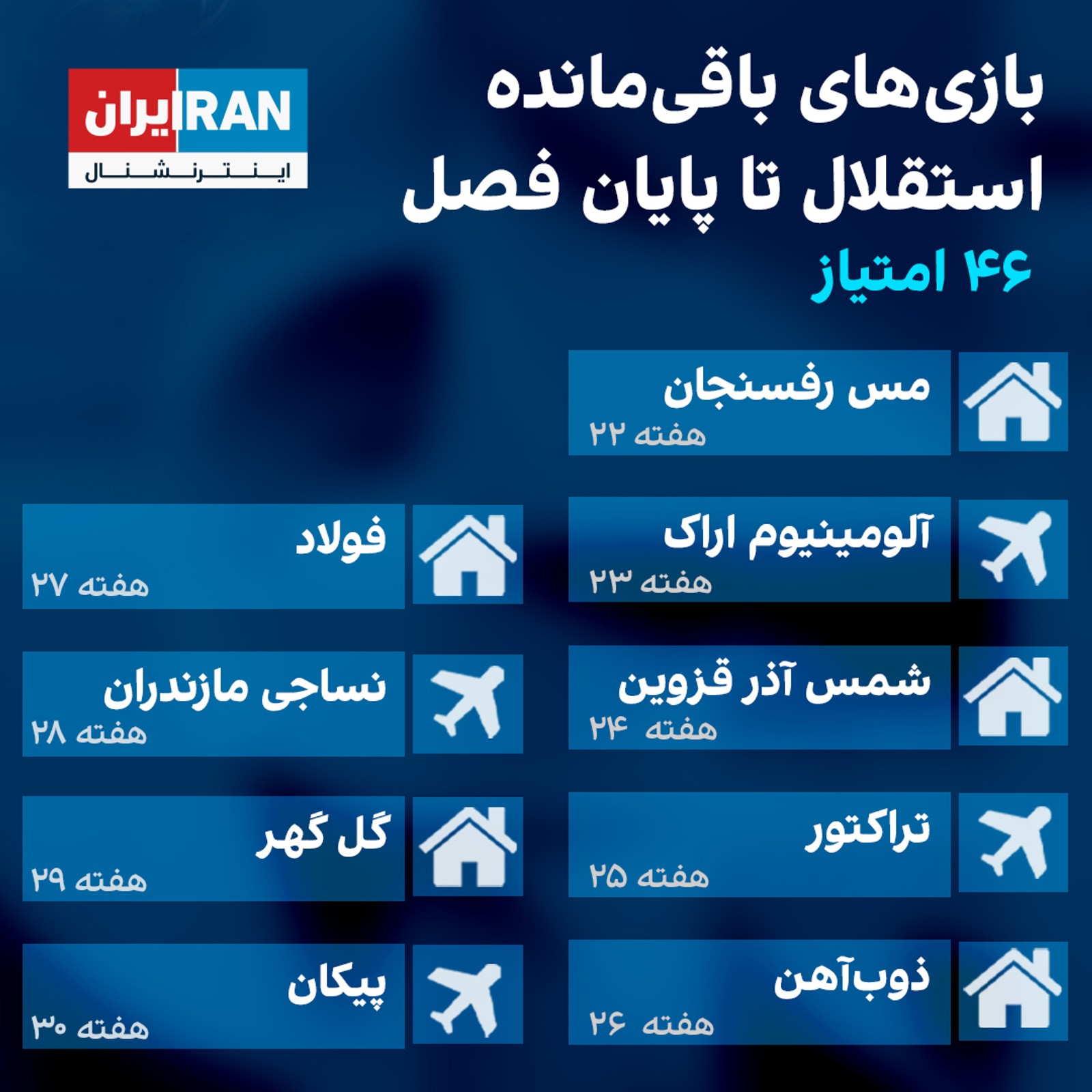 استقلال، صدرنشین ۴۳ امتیازی لیگ برتر، در ۹ دیدار بعدی خود به ترتیب با مس رفسنجان، آلومینیوم اراک، شمسآذر قزوین، تراکتور، ذوبآهن، فولاد، نساجی مازندران، گلگهر و پیکان روبرو خواهد شد.