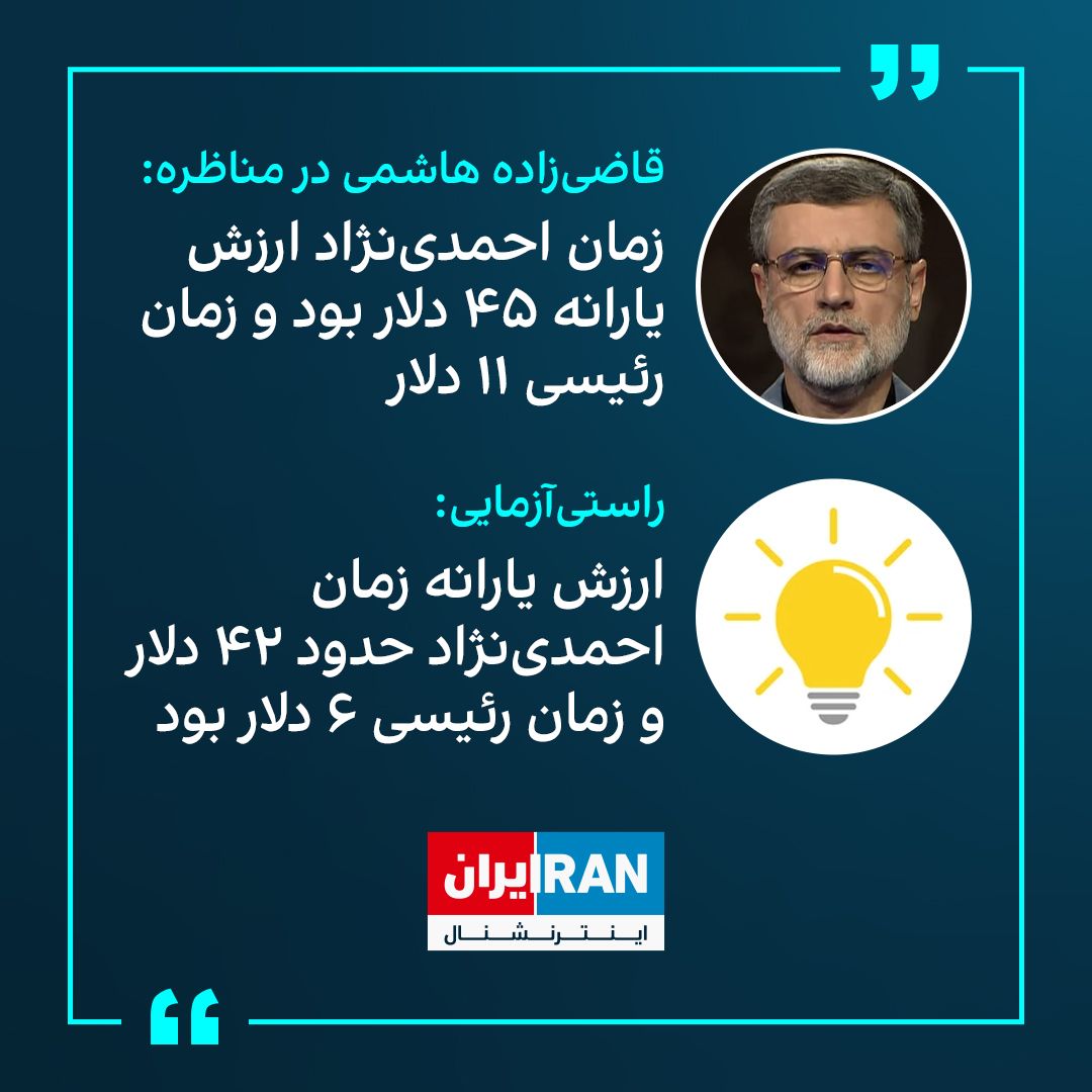 قاضیزاده هاشمی در مناظره گفت در دوره احمدی نژاد ارزش یارانه ۴۵ دلار بود و زمان رییسی ۱۱ دلار شد.