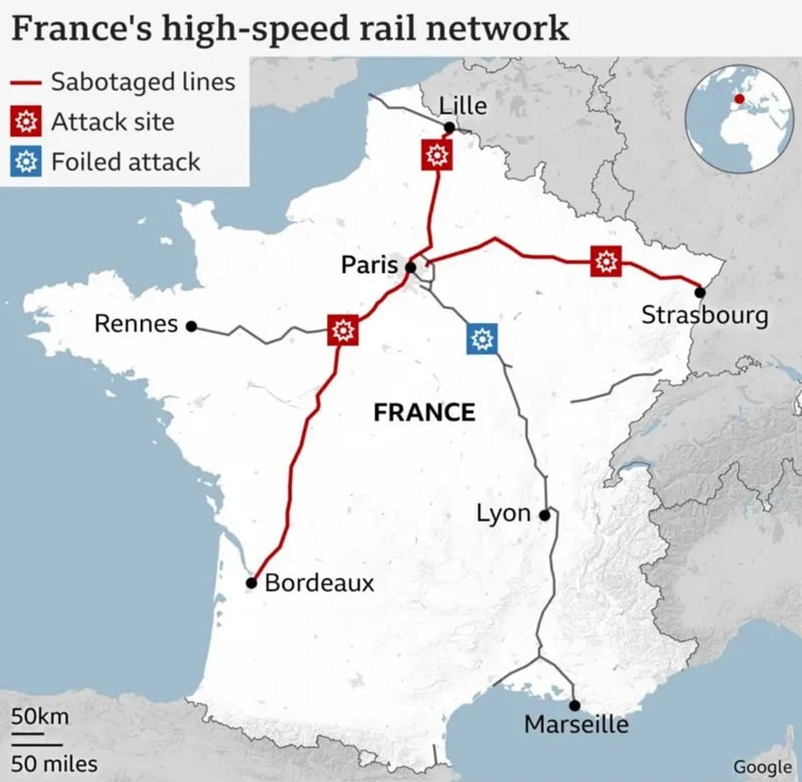 مقامهای فرانسه اعلام کردند این خرابکاری که با ایجاد آتشسوزی در ریلها صورت گرفت عمدی بوده و در حال تحقیق درباره عوامل آن هستند.