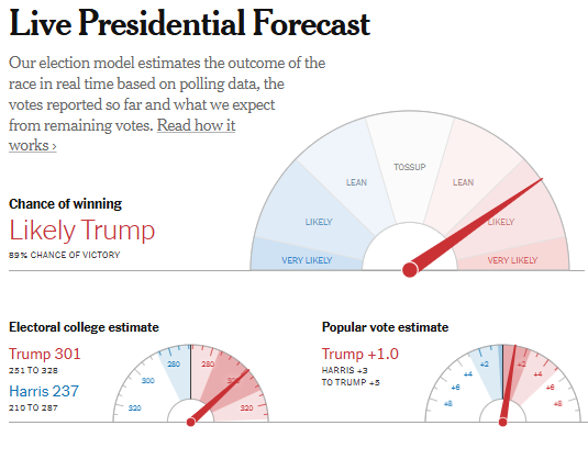 مدل پیشبینی انتخاباتی نیویورک تایمز، که بر اساس دادههای نظرسنجی، آرای گزارششده و آنچه از آرای باقیمانده انتظار میرود عمل میکند، احتمال پیروزی ترامپ را حدود ۹۰ درصد تخمین زد.