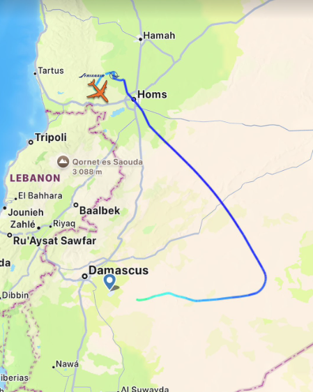 این هواپیما ابتدا به سمت منطقه ساحلی سوریه، یکی از مناطق اصلی فرقه علوی اسد پرواز کرد، اما سپس بهطور ناگهانی تغییر مسیر داد و برای چند دقیقه در جهت مخالف پرواز کرد پیش از آنکه از نقشه ناپدید شود.