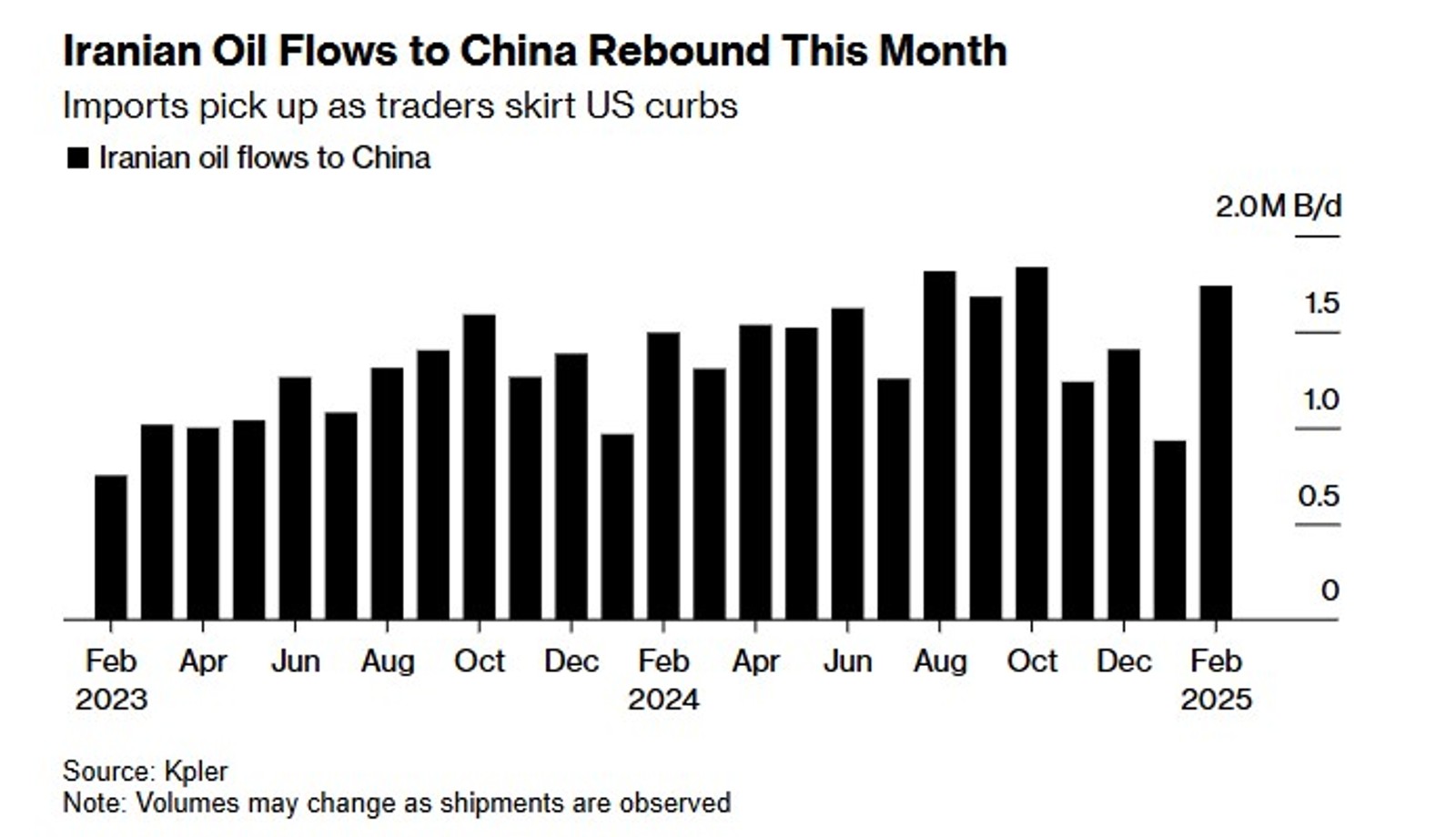 پایگاه خبری بلومبرگ گزارش داد که با دور زدن محدودیتهای آمریکا از سوی معاملهگران، صادرات نفت جمهوری اسلامی به چین در ماه میلادی فوریه افزایش یافته است.