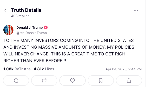دونالد ترامپ، رییسجمهوری آمریکا، جمعه در واکنش به سقوط دو روزه بازارهای جهانی پس از اعلام تعرفههای جدید و اقدامات تلافیجویانه چین، در پیامی در شبکه اجتماعی خود خطاب به سرمایهگذاران نوشت: «به همه سرمایهگذارانی که وارد ایالات متحده میشوند و مقادیر زیادی پول سرمایهگذاری میکنند، میگویم: سیاستهای من هرگز تغییر نخواهند کرد. حالا زمان ثروتمند شدن است، ثروتمندتر از همیشه!!!»