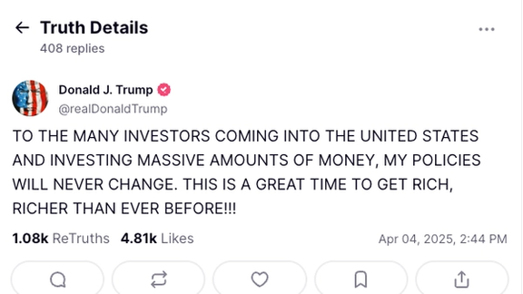 دونالد ترامپ، رییسجمهوری آمریکا، جمعه در واکنش به سقوط دو روزه بازارهای جهانی پس از اعلام تعرفههای جدید و اقدامات تلافیجویانه چین، در پیامی در شبکه اجتماعی خود خطاب به سرمایهگذاران نوشت: «به همه سرمایهگذارانی که وارد ایالات متحده میشوند و مقادیر زیادی پول سرمایهگذاری میکنند، میگویم: سیاستهای من هرگز تغییر نخواهند کرد. حالا زمان ثروتمند شدن است، ثروتمندتر از همیشه!!!»