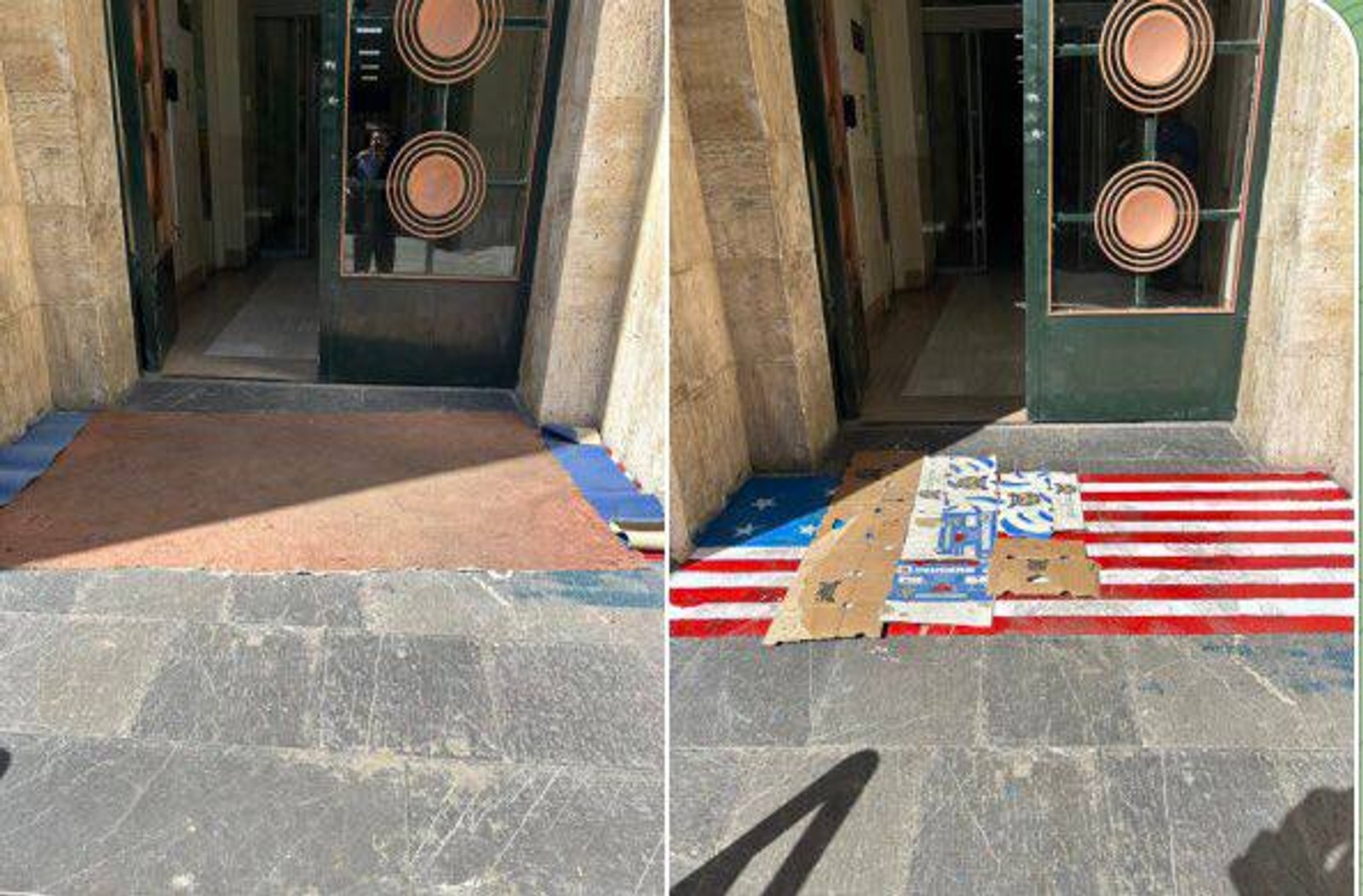 تصاویر منتشرشده در رسانههای اجتماعی نشان میدهد همزمان با مذاکرات میان جمهوری اسلامی و آمریکا، مسئولان دانشگاه تهران پرچم ایالات متحده را که روی زمین ورودی دانشکده حقوق و علوم سیاسی نقاشی کرده بودند، پوشاندهاند.