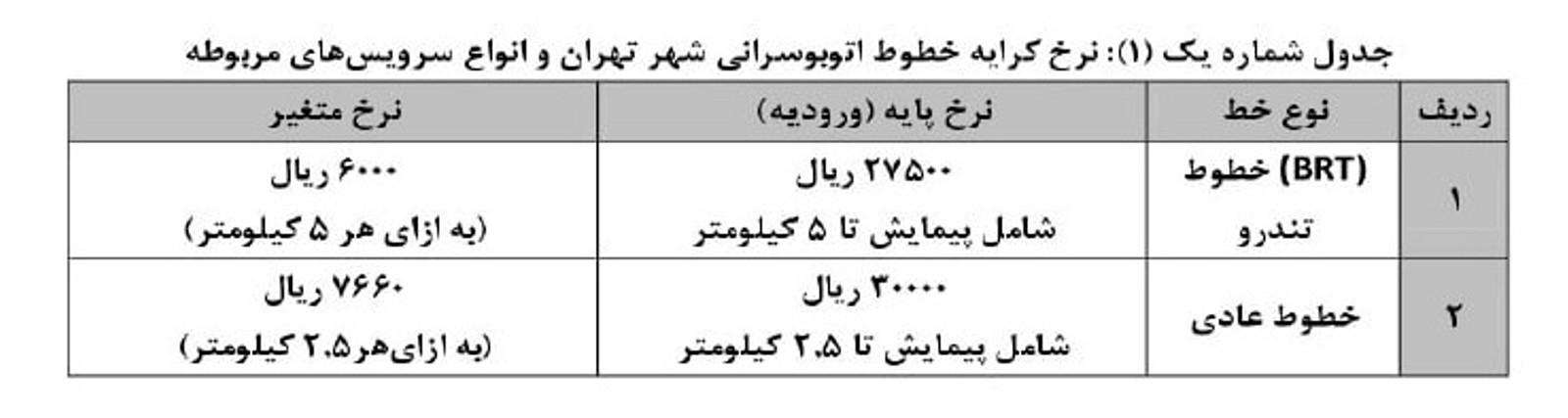 برای اتوبوسهای خطوط عادی نیز شهروندان باید برای ورود و طی مسافتی تا دو و نیم کیلومتر، سه هزار تومان و به ازای هر دو و نیم کیلومتر دیگر، ۷۶۶ تومان پرداخت کنند.