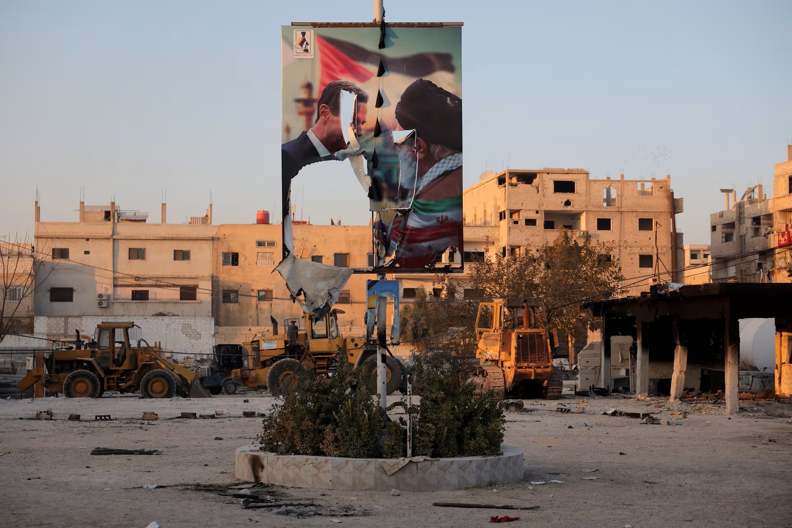 پوستر پارهشدهای از دیدار بشار اسد، رییس جمهور سابق سوریه، با علی خامنهای در منطقه سیده زینب سوریه