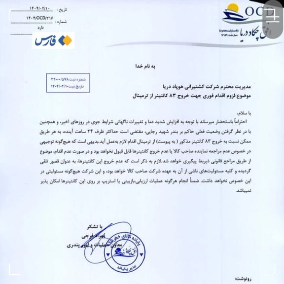خبرگزاری فارس تصویری از دستور فوری شرکت افق چکاد دریا به شرکت کشتیرانی هوپاد دریا را منتشر کرد که در آن از هوپاد دریا خواسته شده طی ۲۴ ساعت «به هر طریق ممکن» ۸۳ کانتینر خود را از بندر خارج کند.