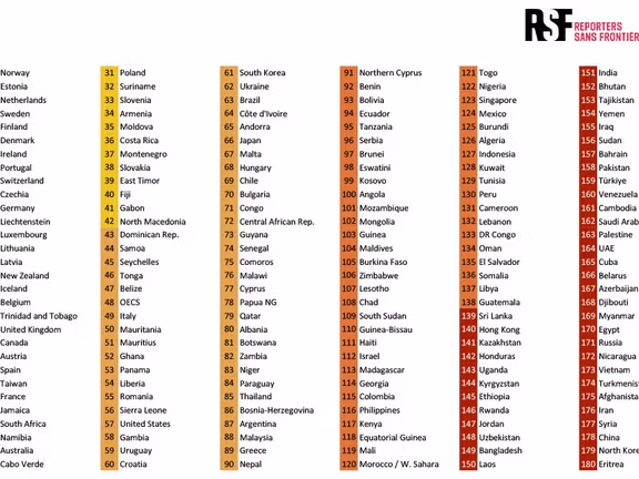 کشورهای نروژ، استونی، هلند، سوئد، فنلاند، دانمارک، ایرلند، پرتغال، سوئیس و چک رتبههای اول تا دهم شاخص آزادی مطبوعات در سال ۲۰۲۵ را به خود اختصاص دادهاند.