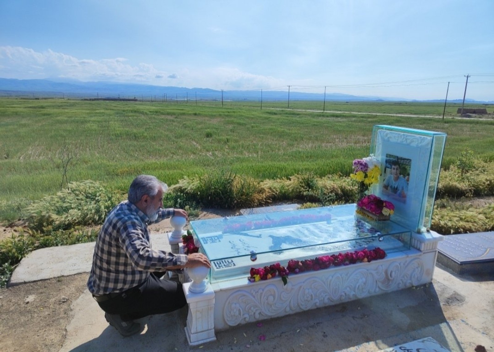 علی آدینهزاده بر سر مزار پسرش ابوالفضل