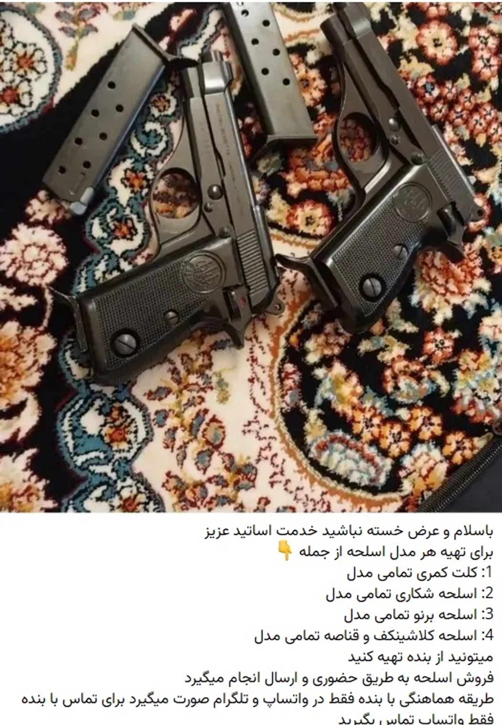 براساس یافتههای ایراناینترنشنال فروشندگان در پلتفرمهای آنلاین و از جمله تلگرام بهطور علنی سلاحهایی از تپانچه گرفته تا تفنگهای کلاشینکف را عرضه میکنند.