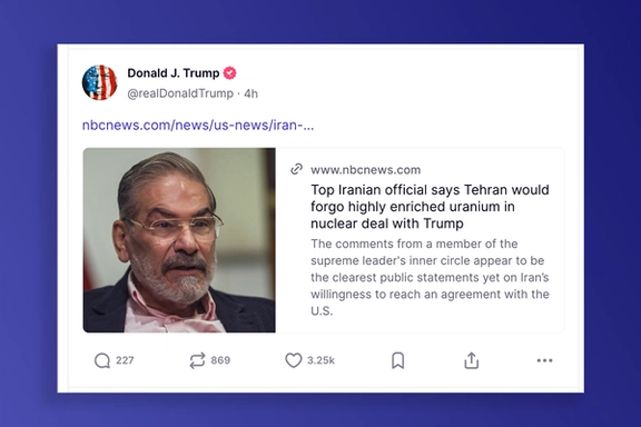 دونالد ترامپ، رییسجمهوری آمریکا، مصاحبه علی شمخانی با شبکه انبیسی درباره آمادگی جمهوری اسلامی برای «صرف نظر از اورانیوم با غنای بالا» را در شبکه اجتماعی خود، تروت سوشال، بازنشر کرد.