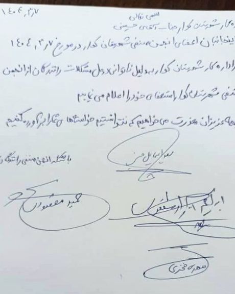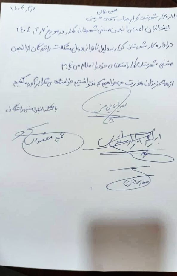 بر اساس تصویر نامهای که این تشکل صنفی منتشر کرده است، اعضای انجمن صنفی رانندگان شهرستان کوار، چهارشنبه هفتم خرداد اعلام کردند که بهدلیل ناتوانی در حل مشکلات رانندگان، از سمت خود استعفا دادهاند.