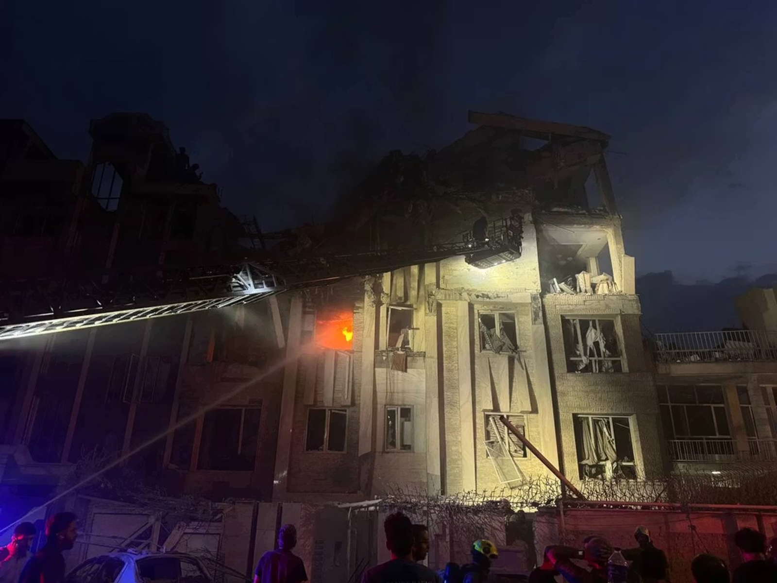 این ساختمان در پی حمله اسرائیل بهشدت آسیب دیده و تخریب شده است. در این ویدیو دیده میشود که گروهی از مردم برای تماشای محل حادثه در اطراف ساختمان جمع شدهاند.
