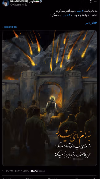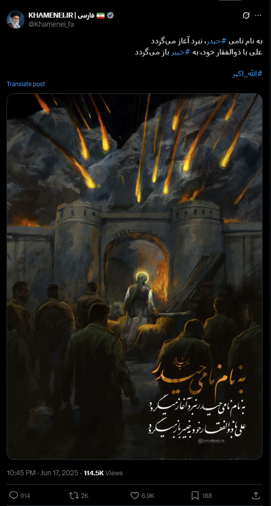 او در این پست نوشت: به نام نامی حیدر، نبرد آغاز میگردد، علی با ذوالفقار خود، به خیبر باز میگردد.