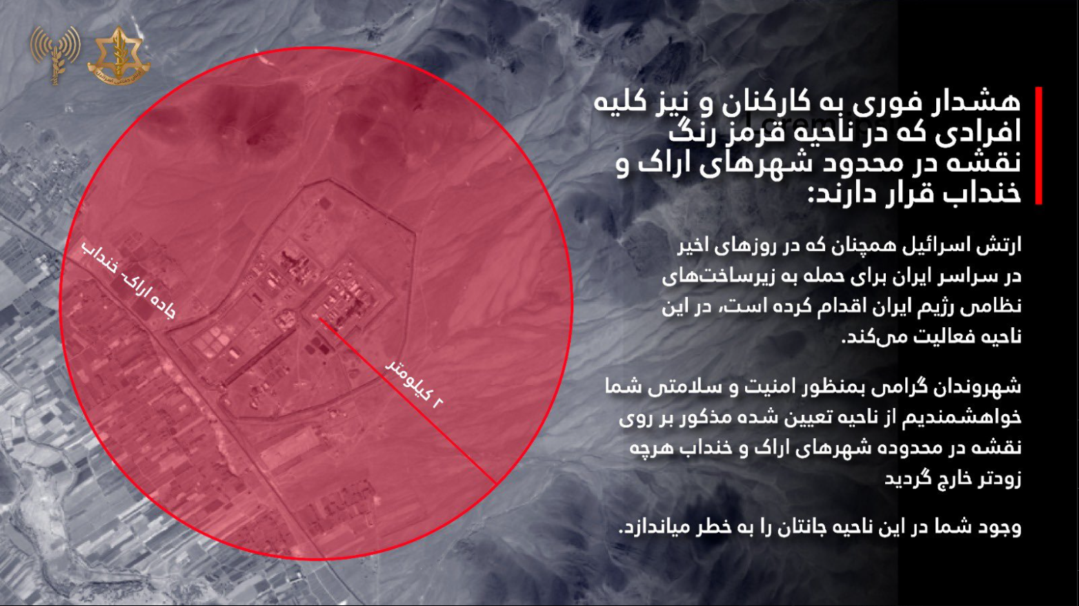 ارتش اسرائیل دقایقی پیش هشدار تخلیه برای ساکنان شهرهای اراک و خنداب صادر کرد. در این هشدار آمده است: هشدار فوری به کارکنان و نیز کلیه افرادی که در ناحیه قرمز رنگ نقشه در محدود شهرهای اراک و خنداب قرار دارند. ارتش اسرائیل همچنان که در روزهای اخیر در سراسر ایران برای حمله به زیرساختهای نظامی رژیم ایران اقدام کرده است، در این ناحیه فعالیت میکند.شهروندان گرامی بمنظور امنیت و سلامتی شما خواهشمندیم از ناحیه تعیین شده مذکور بر روی نقشه در محدوده شهرهای اراک و خنداب هرچه زودتر خارج گردید.وجود شما در این ناحیه جانتان را به خطر میاندازد.