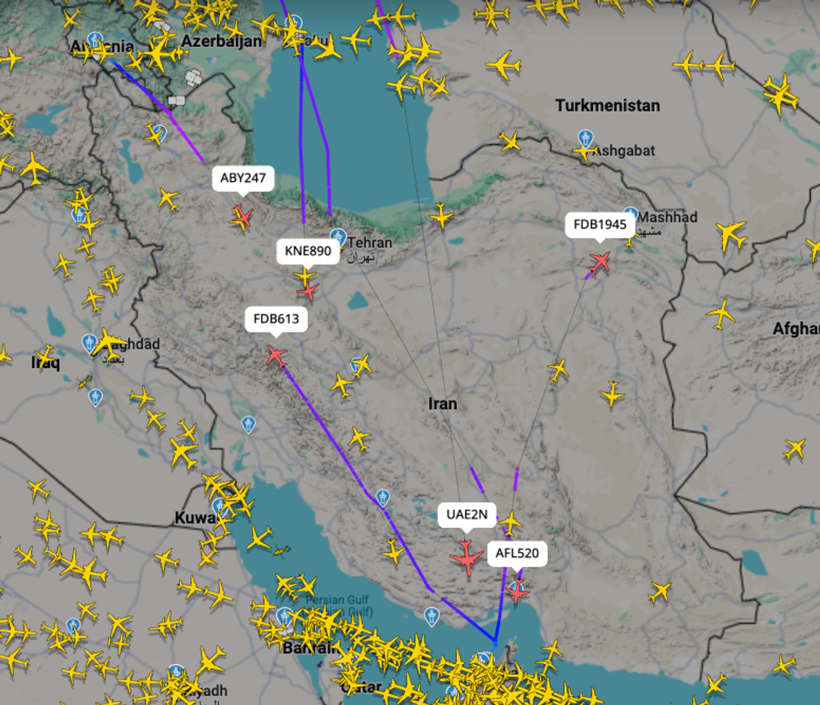بررسی داده‌های پروازی وب‌سایت فلایت‌رادار نشان می‌دهد هواپیماهای در حال پرواز بر فراز آسمان ایران موقعیت مکانی خود را مخابره نمی‌کنند.