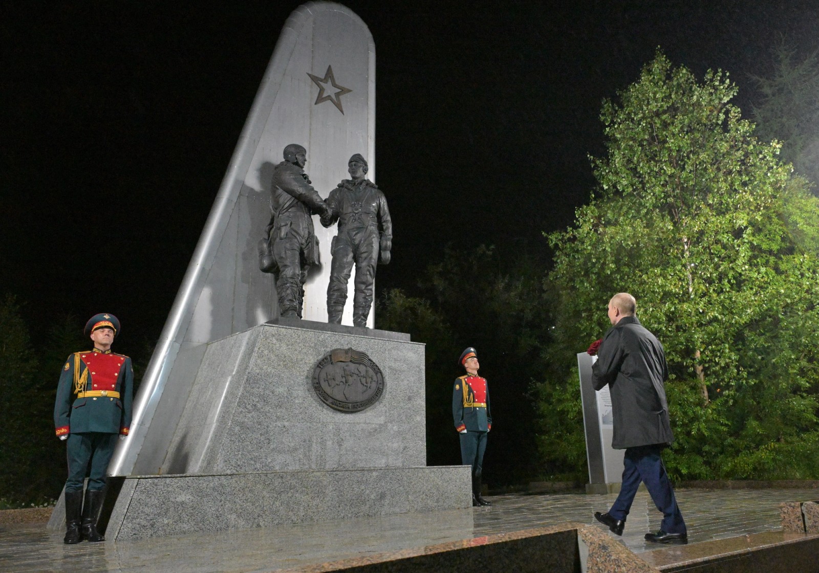 ولادیمیر پوتین، رییس‌جمهور روسیه، در شهر ماگادان در خاور دور روسیه، گل‌هایی بر یادبودی گذاشت که همکاری آمریکا و شوروی در طول جنگ جهانی دوم را گرامی می‌دارد.
