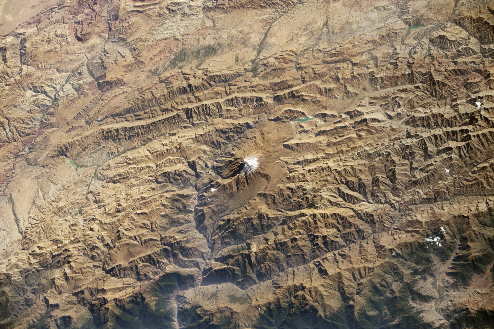 برفهای زمستانی ویژگیهای ریختشناسی آتشفشان دماوند را در این تصویر از ایستگاه فضایی بینالمللی ناسا برجسته میکنند