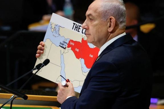 نتانیاهو گفت: «سال گذشته در همین جایگاه ایستادم و این نقشه را نشان دادم. این نقشه، نفرین محور ترور ایران را نشان میدهد. این محور، صلح کل جهان را تهدید کرد. ثبات منطقه ما و حتی موجودیت کشور من، اسرائیل، را تهدید کرد.»