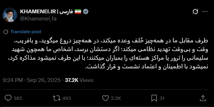 صفحه علی خامنهای در شبکه ایکس پس از تصمیم شورای امنیت مبنی بر بازگشت تحریمها و در پی فعالسازی مکانیسم ماشه بخشی از سخنان او را بازنشر کرد که گفته بود: «طرف مقابل ما در همهچیز خُلف وعده میکند، در همهچیز دروغ میگوید، و با فریب، وقت و بیوقت تهدید نظامی میکند.»