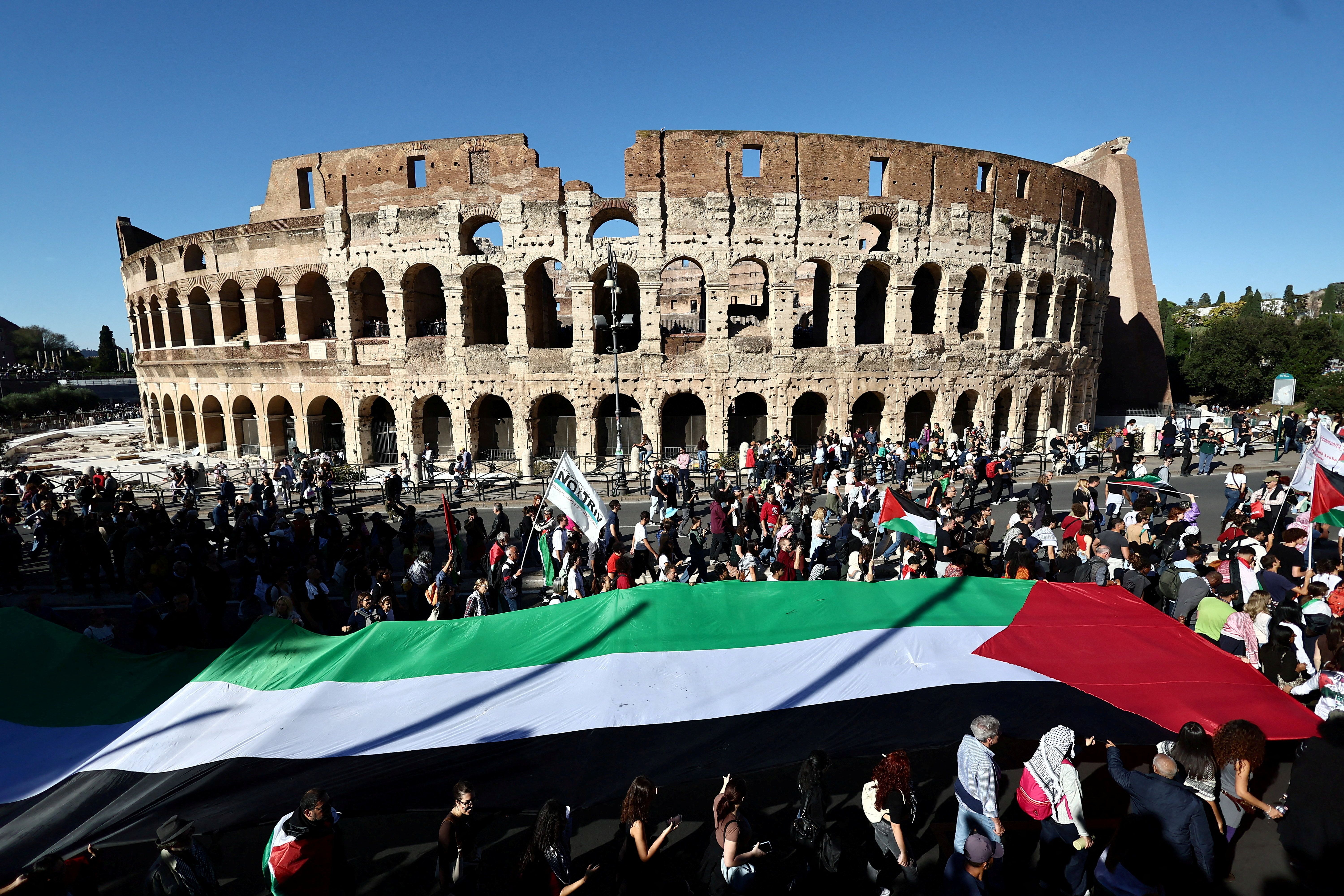 گروهی از معترضان شنبه در مرکز رم گرد هم آمدند تا در چهارمین روز متوالی از اعتراضات طرفداران فلسطین در ایتالیا شرکت کنند.