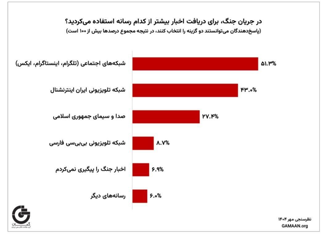 بر اساس دادههای این نظرسنجی، شبکههای اجتماعی (مانند تلگرام، اینستاگرام و ایکس) منبع اصلی مردم برای اطلاع از اخبار در زمان جنگ بود و بیش از نیمی از جامعه (۵۱ درصد) از این طریق اخبار جنگ را دریافت کردند.