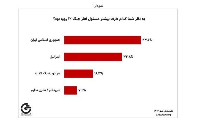 حدود ۴۴ درصد جامعه جمهوری اسلامی را مسئول شروع جنگ خواندند، در حالی که ۳۳ درصد اسرائیل را مسئول آغاز جنگ معرفی کردند و ۱۶ درصد هر دو طرف را به یک اندازه مقصر دانستند.