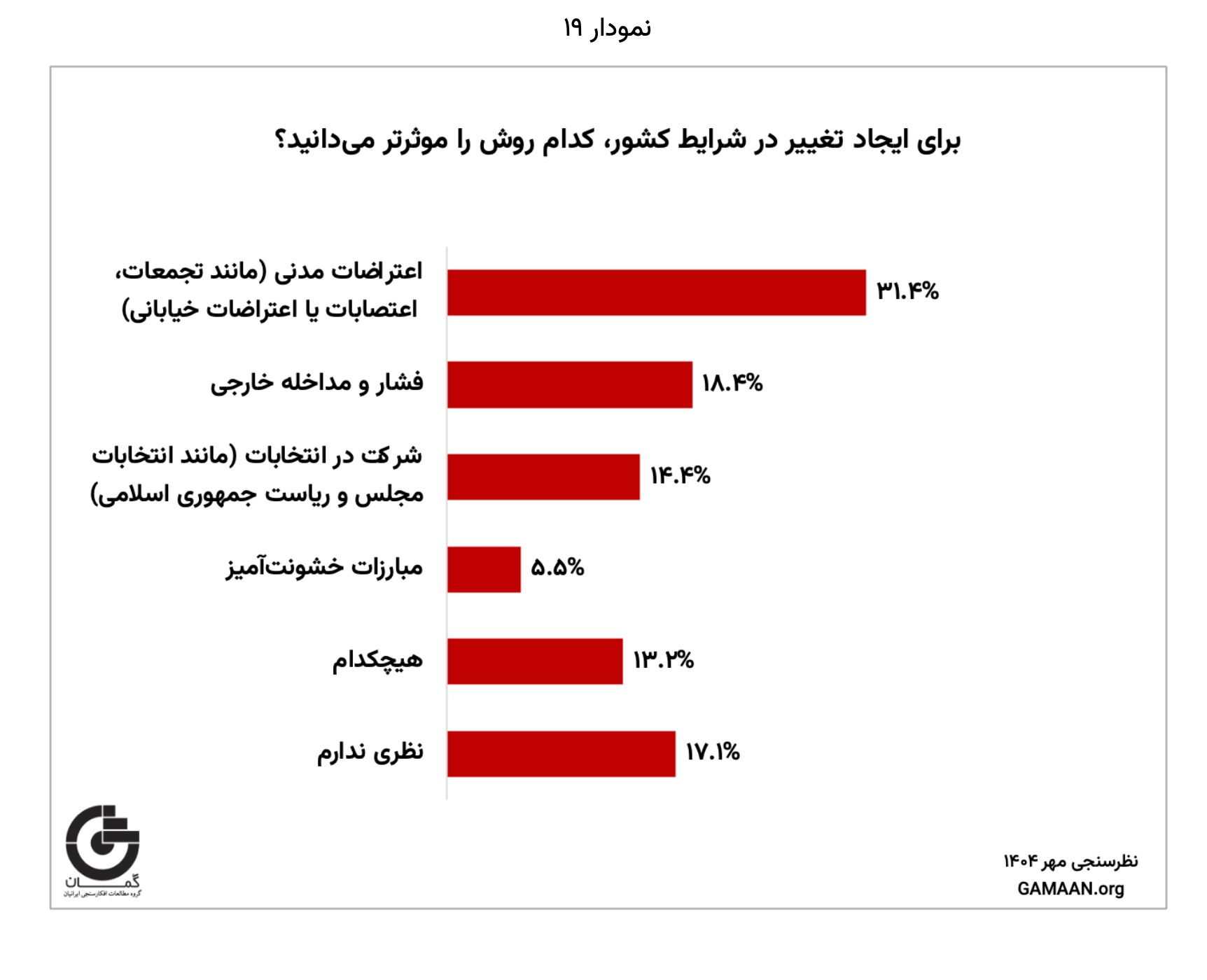 در مقابل، ۱۶ درصد مشارکتکنندگان جمهوری اسلامی را موفقتر ارزیابی کردند و ۱۹ درصد هر دو طرف را ناکام دانستند.