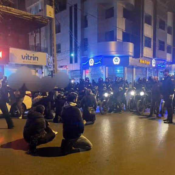 تصویر رسیده به ایران اینترنشنال همزمان با ششمین روز اعتراضات سراسری نشان میدهد دو معترض در مشهد مقابل ماموران سرکوبگر حکومت روی زمین نشستهاند.
