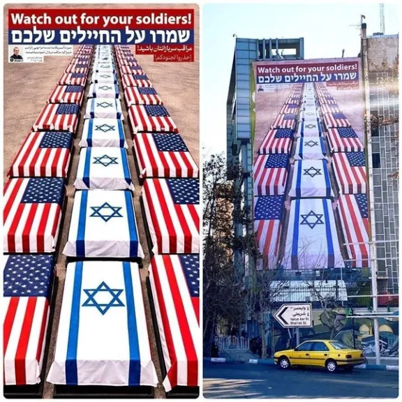 در پی هشدار ترامپ به جمهوری اسلامی درباره سرکوب معترضان، و واکنش مقامهای ایران به آن، دیوارنگاره جدیدی در میدان «فلسطین» تهران نصب شده که در آن حکومت ایران به کشتن سربازان آمریکایی و اسرائیلی تهدید کرده است.