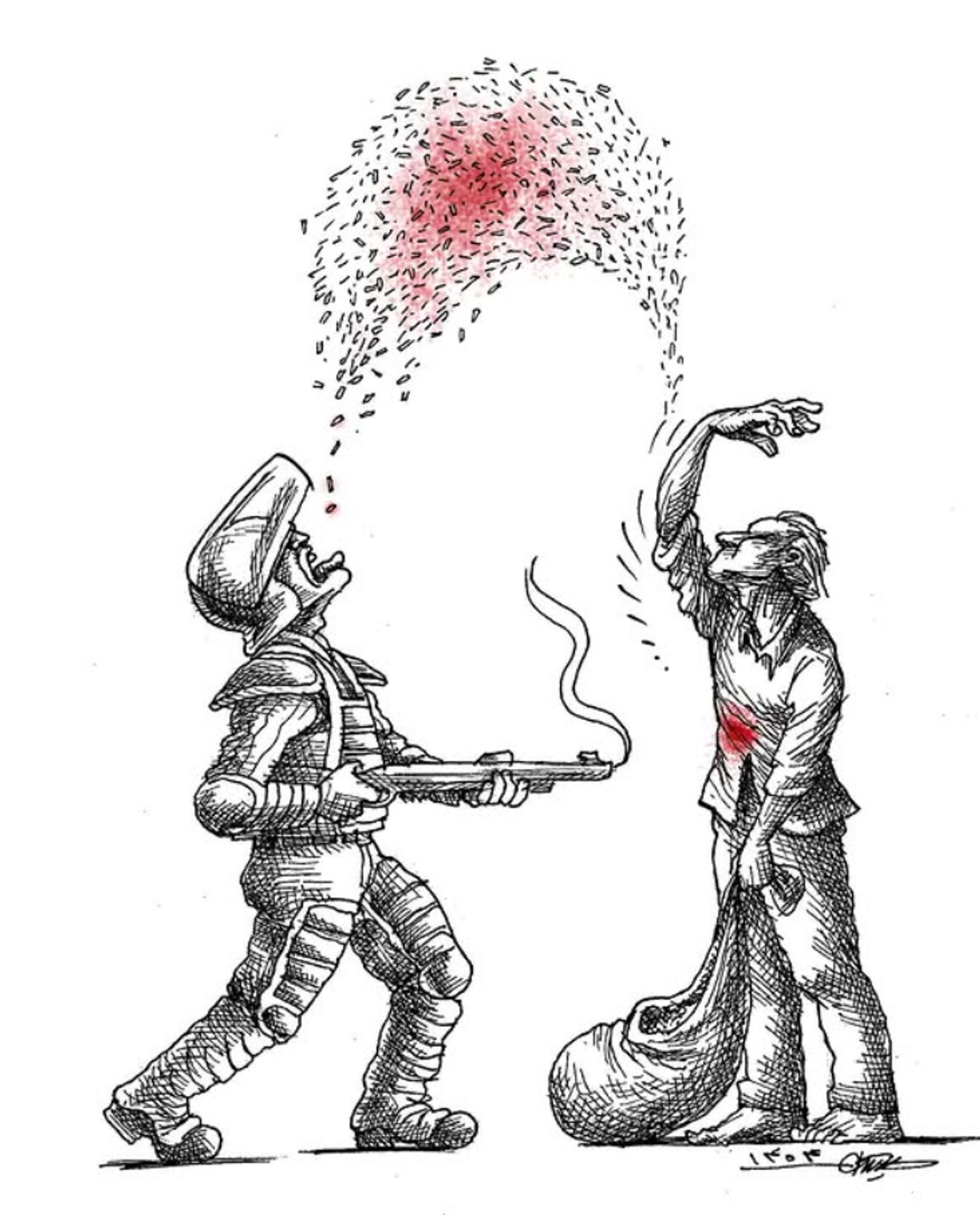 الا بارون، کارتونیست، با انتشار طرحی در روزنامه گاردین، تقابل دستان به خون آغشته دیکتاتور تهران با مردم ایران را به تصویر کشید.