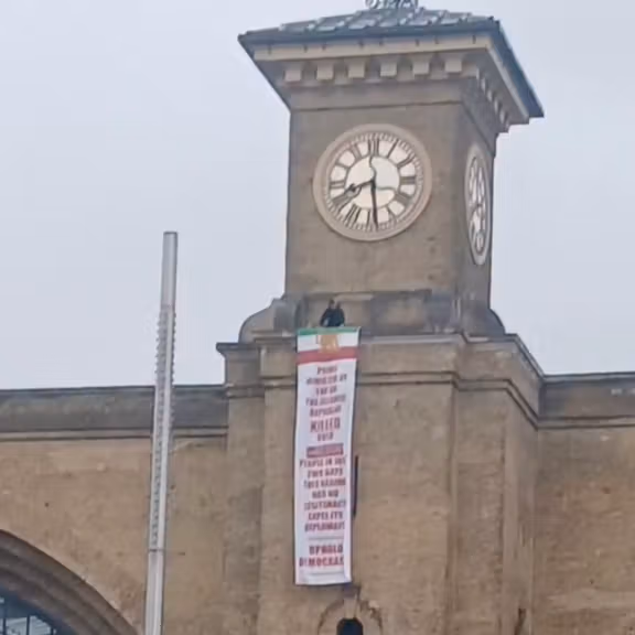 یک شهروند ایرانی روز جمعه ۱۰ بهمن با رفتن به بالای ساختمان ایستگاه قطر «کینگز کراس» لندن، بنری اعتراضی خطاب به کییر استارمر، نخستوزیر بریتانیا، برافراشت.