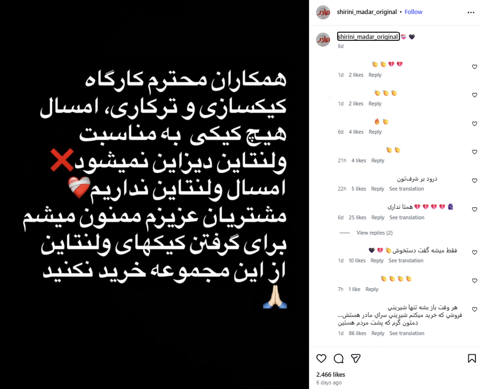 شیرینیفروشی مادر ۲۲ بهمن با انتشار تصویری از یک متن بر پسزمینه سیاه در شبکه اجتماعی اینستاگرام، خطاب به مشتریانش نوشت: «امسال هیچ کیکی به مناسبت ولنتاین دیزاین نمیشود. امسال ولنتاین نداریم.»