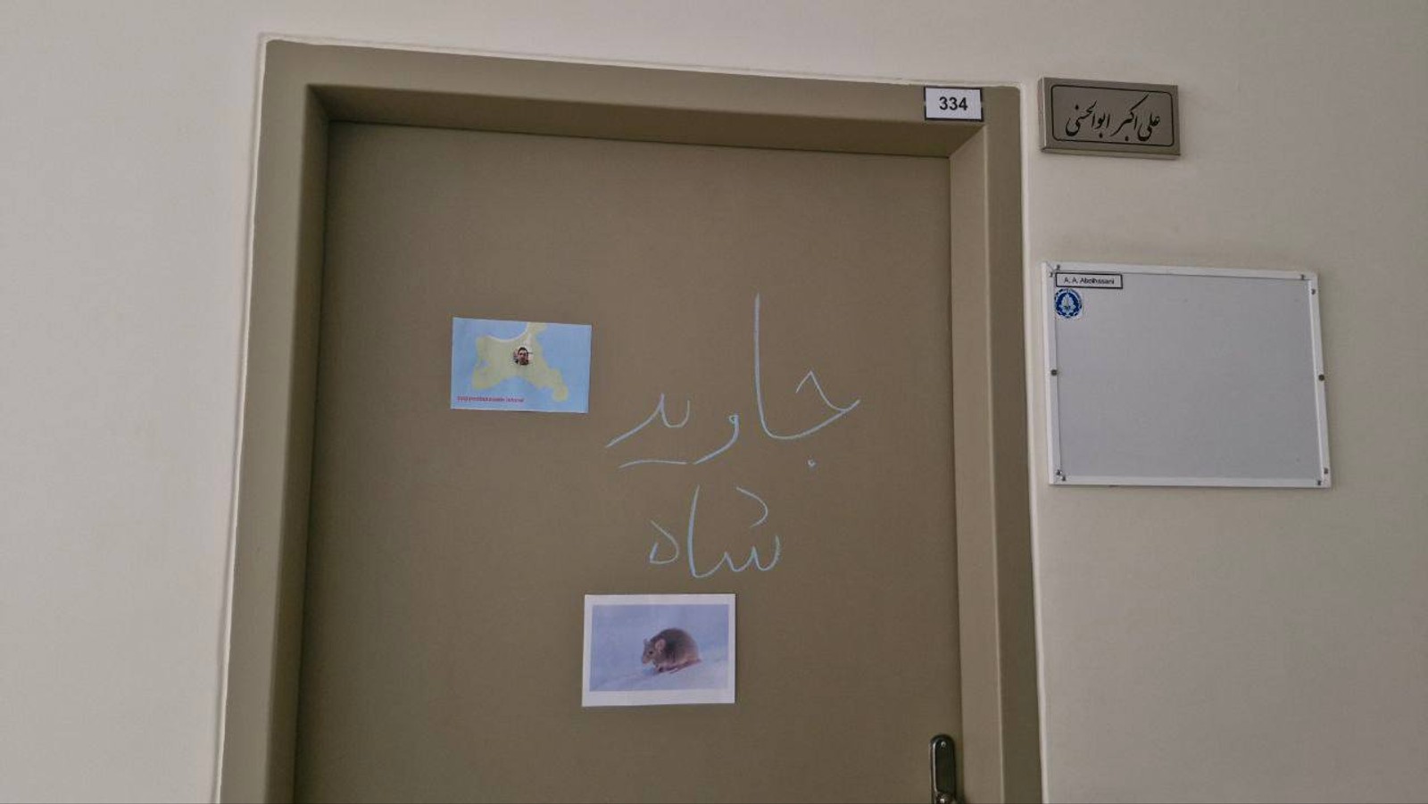 تصویر رسیده به ایران اینترنشنال نشان میدهد دانشجویان دانشگاه صنعتی شریف روی در اتاق علیاکبر ابوالحسنی، مدرس این دانشگاه و عضو بسیج اساتید که در اعتراضات دانشجویی با آنها درگیری لفظی داشت، شعار «جاوید شاه» را نوشتند.