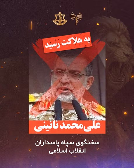 ارتش اسرائیل اعلام کرد نیروی هوایی این کشور شب گذشته علیمحمد نائینی، سخنگو و رییس بخش روابط عمومی سپاه پاسداران انقلاب اسلامی را کشته است.
