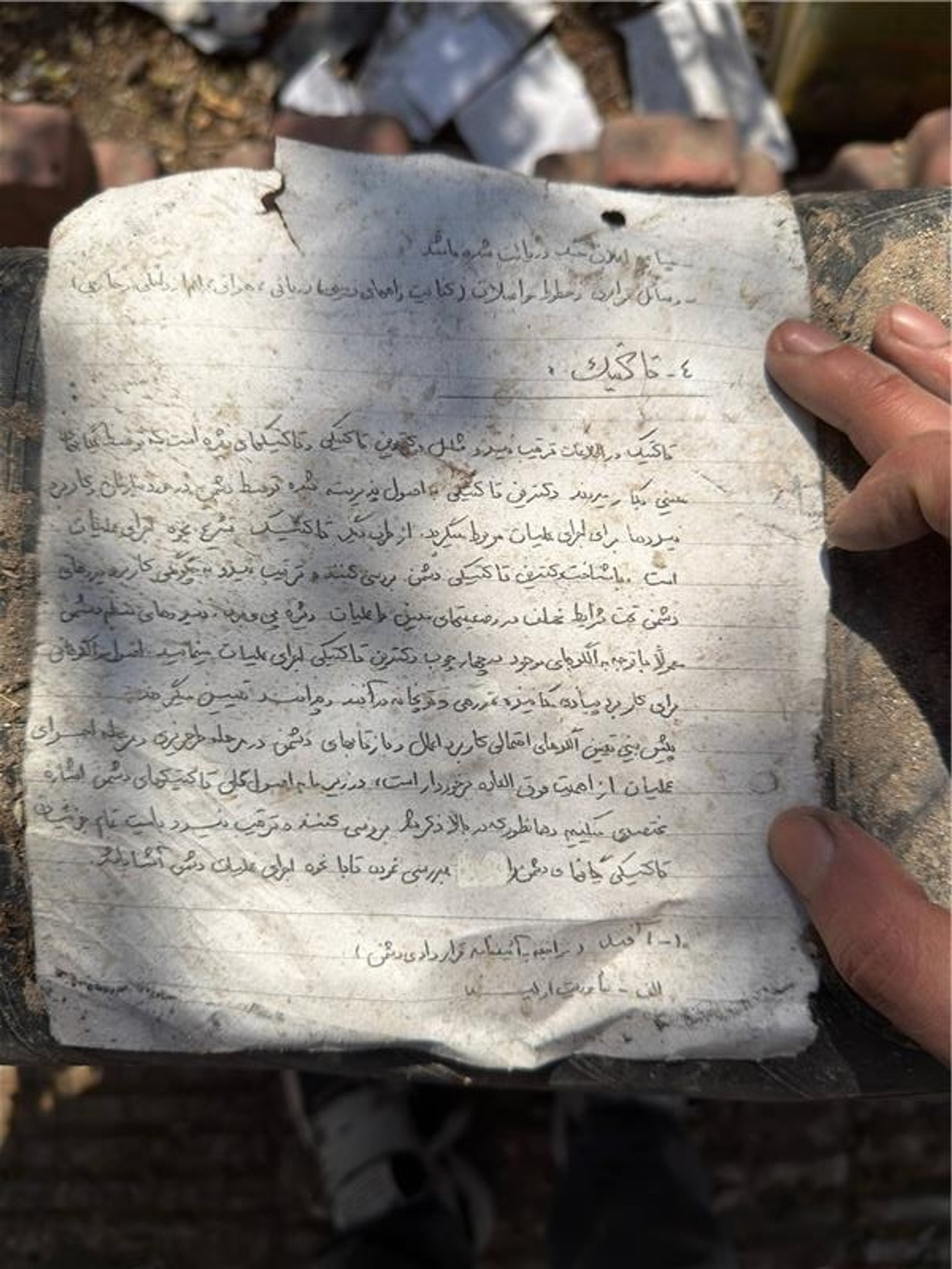 او تصاویری از صفحات جزواتی را ارسال کرده که در پی تخریب ساختمان پخش شدهاند. این جزوات حاوی متنهای اطلاعاتی و امنیتی است.