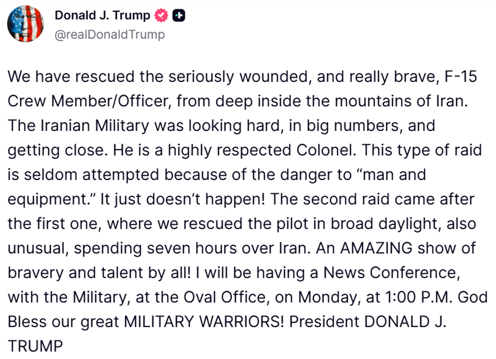 دونالد ترامپ، رییسجمهوری آمریکا، با انتشار پستی در شبکه اجتماعی تروثسوشال نوشت: «ما یکی از اعضای بسیار شجاع و بهشدت مجروح خدمه اف-۱۵ را از عمق کوههای ایران نجات دادیم.»