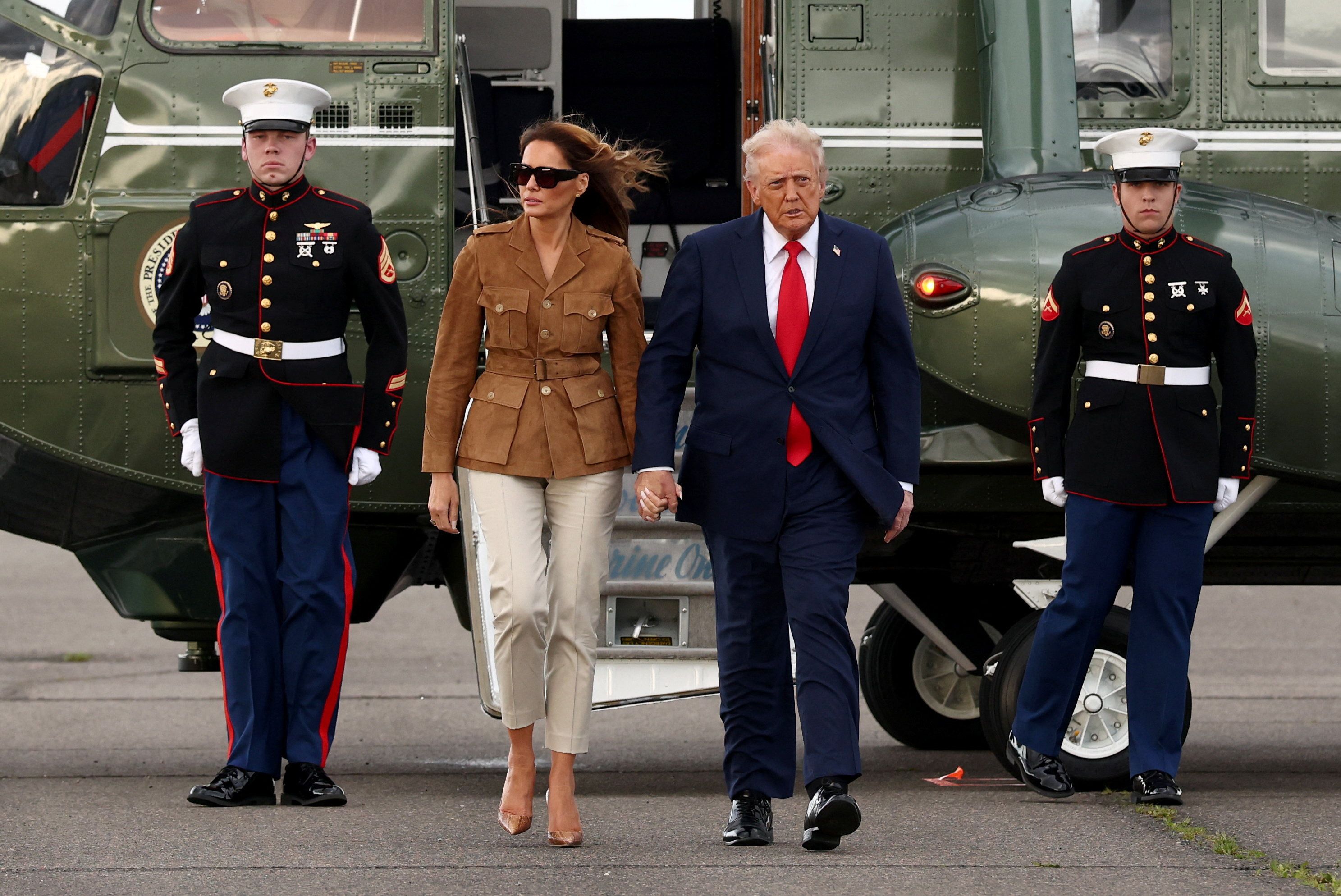 ترامپ و همسرش، ملانیا، سوار خودروی تشریفات شدند و مسافتی کوتاه را طی کردند تا به هلیکوپتر برای پرواز به فرودگاه استنستد لندن برسند، جایی که «ایرفورس وان» در آن منتظر ترامپ بود.