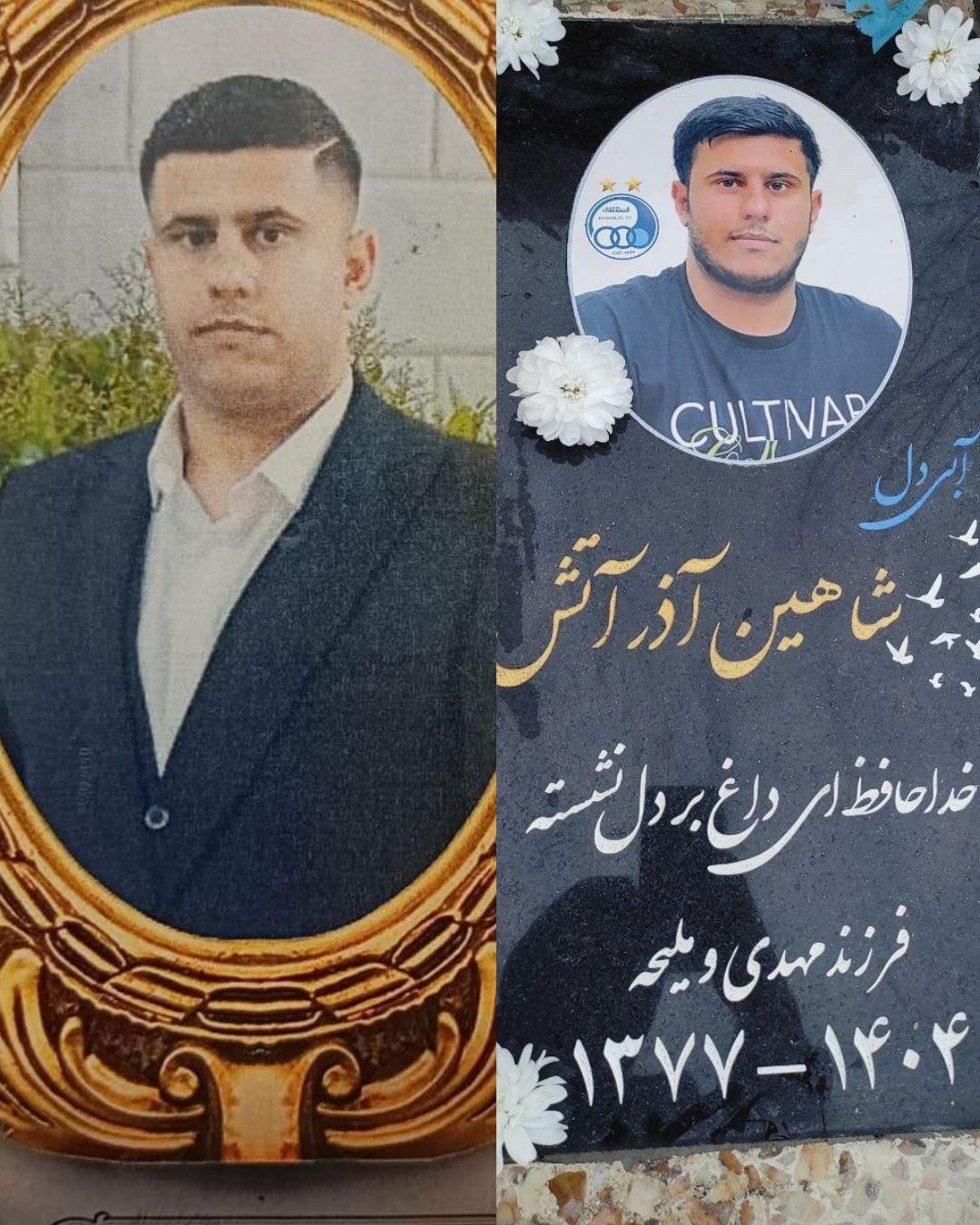 تصاویر رسیده به ایران اینترنشنال نشان میدهد روی سنگ مزار جاویدنام شاهین آذرآتش، لوگوی باشگاه استقلال حک شده و او را آبیدل نامیدند.