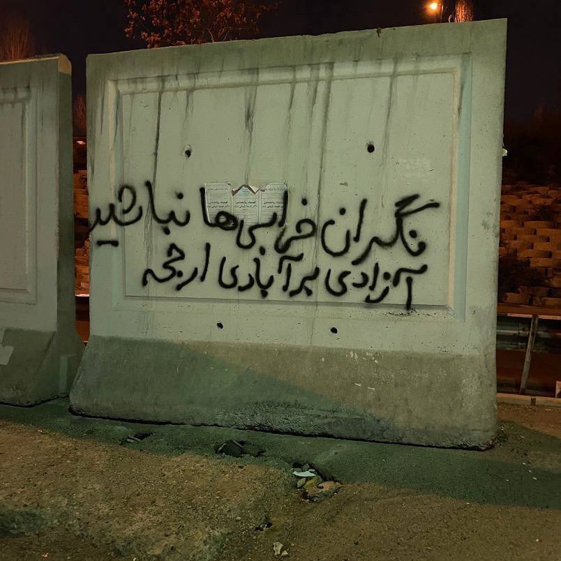 تصویر منتشرشده در رسانههای اجتماعی نشان میدهد در تهران یک شهروند درباره جنگ روی دیوار شعارنویسی کرده است: «نگران خرابیها نباشید، آزادی بر آبادی ارجحیت دارد.»